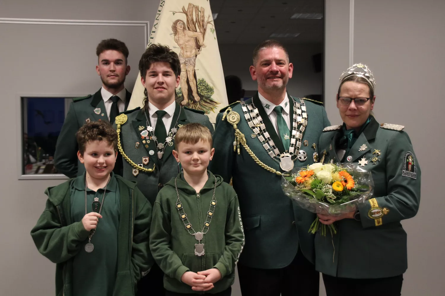 von links nach rechts, vorne: Cilian Sinzig, Tom Stümperhinten: Max Dasbach mit Standarte, Max Klatte, Stefan und Sabine Fuchshofen